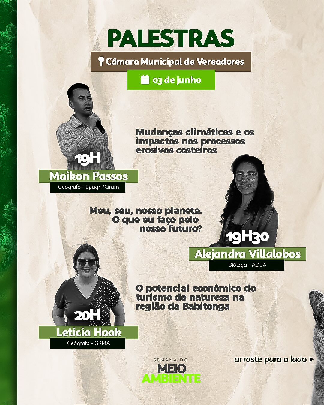 19h30 – Alejandra Villalobos (Bióloga – ADEA): “Meu, seu, nosso planeta. O que eu faço pelo nosso futuro?”;