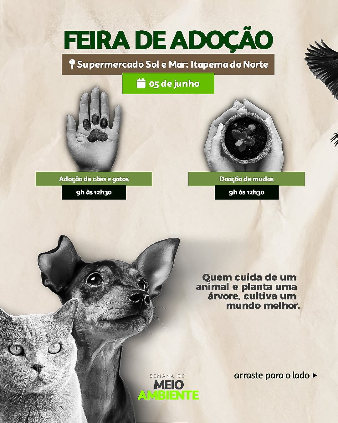 No Dia Mundial do Meio Ambiente, será realizada uma feira no estacionamento do Supermercado Sol e Mar (Itapema do Norte), das 9h às 12h30, com: