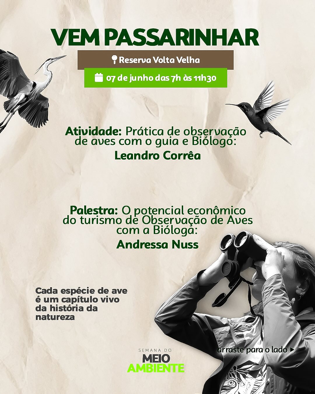 A programação encerra com a atividade “Vem Passarinhar”, das 7h às 11h30, na Reserva Volta Velha. A ação inclui prática de observação de aves com o biólogo Leandro Corrêa e palestra sobre turismo de observação com a bióloga Andressa Nuss.