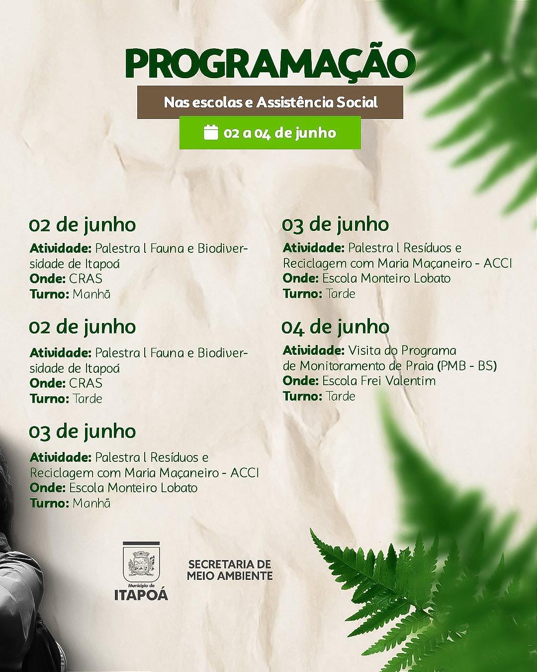 A Prefeitura de Itapoá, por meio da Secretaria de Meio Ambiente, realiza entre os dias 2 e 7 de junho, a Semana do Meio Ambiente 2025. Com uma programação especial voltada à valorização da natureza e à conscientização ambiental, o evento inclui atividades gratuitas e abertas ao público, como palestras, oficinas, trilhas, feiras, rodas de conversa e observação de aves.