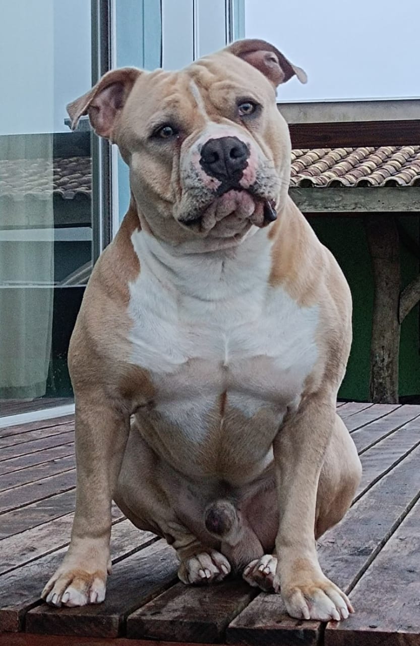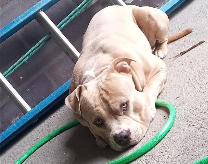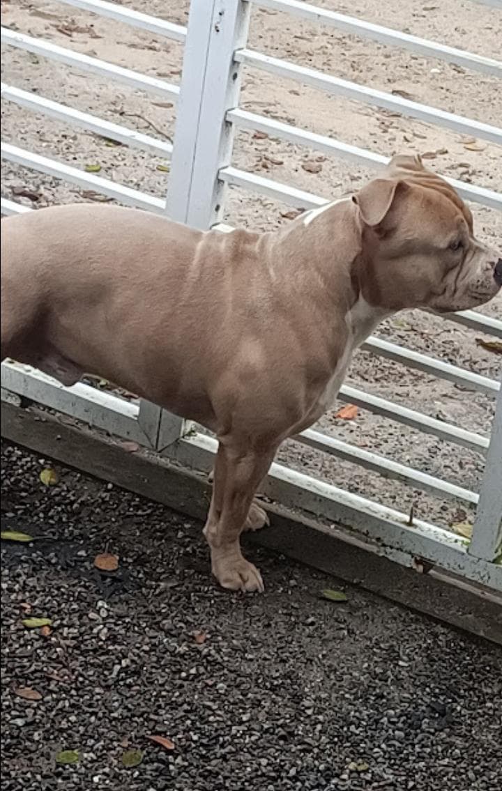 Cão da raça American Bully desapareceu no início da semana no bairro Itapoá Centro; tutor oferece recompensa e faz apelo por informações