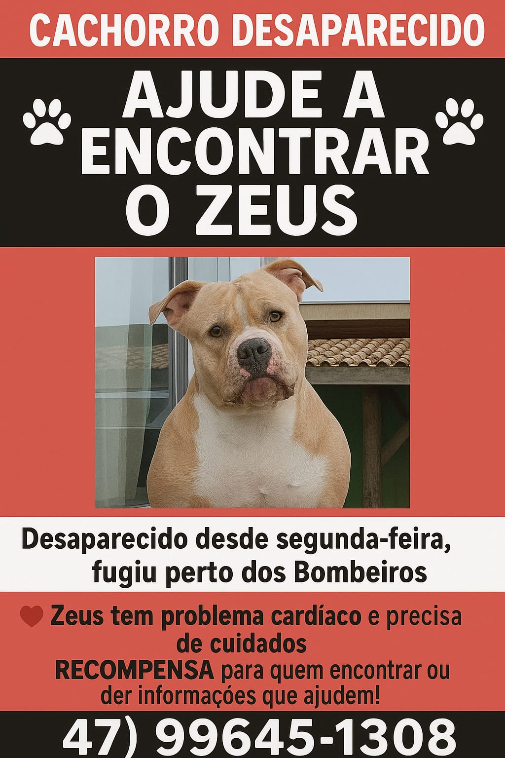 Desde a tarde de segunda-feira (09 de junho), um cão da raça American Bully chamado Zeus está desaparecido em Itapoá. O tutor, Eduardo Schoeffel, morador do bairro Itapoá Centro, está desesperado em busca de informações e oferece recompensa a quem ajudar a localizar o animal.