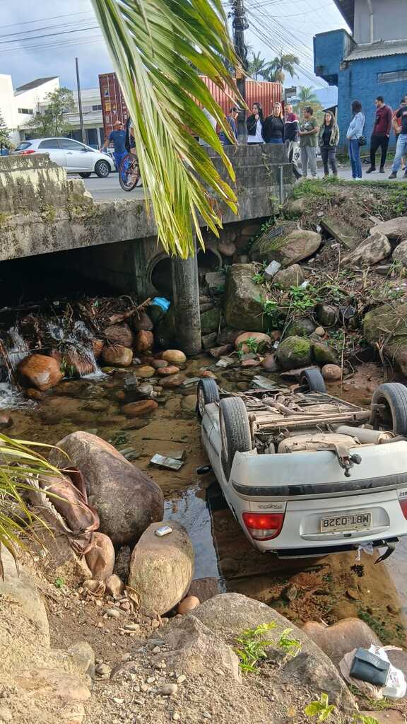 Carro cai em rio após colisão e três pessoas ficam feridas em Garuva