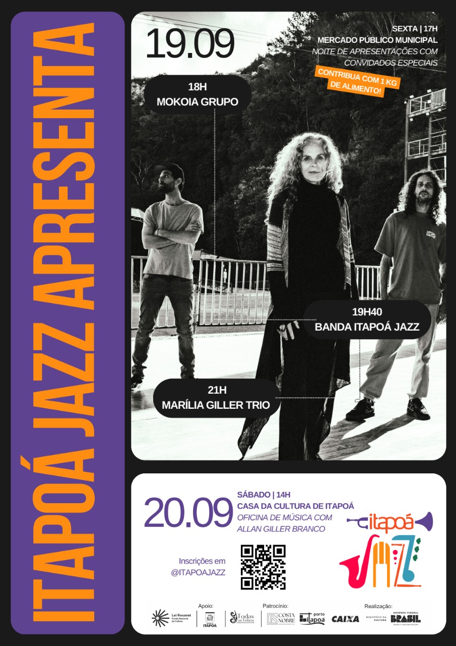 Na sexta-feira (19/09), a partir das 17h, o público poderá assistir a apresentações de três atrações musicais: Mokoia Grupo, Banda Itapoá Jazz e Marília Giller Trio, encerrando a noite no Mercado Público Municipal. No dia seguinte, sábado (20/09), às 14h, a Casa da Cultura de Itapoá recebe a oficina gratuita de música com o instrumentista Allan Giller Branco, voltada a professores, músicos e estudantes interessados.