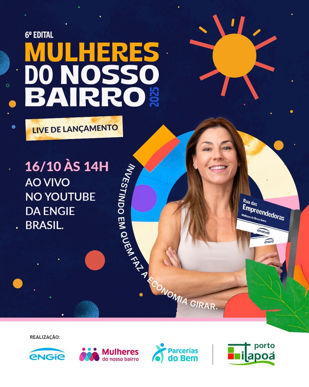 O lançamento oficial do edital do projeto “Mulheres do Nosso Bairro 2025” será no próximo dia 16 de outubro (quinta-feira), às 14h, durante uma live no canal da Engie no YouTube.