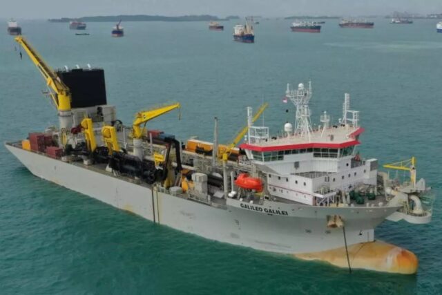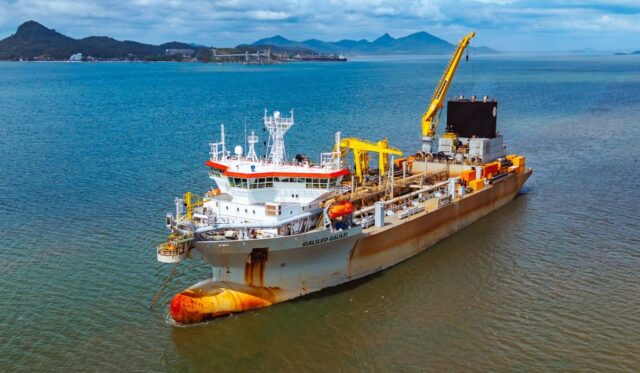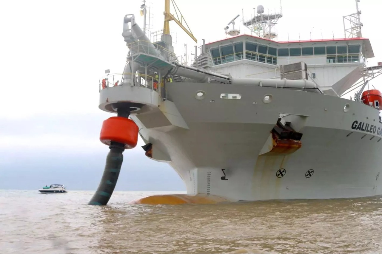 Construída em 2020 e com bandeira de Luxemburgo, a draga Galileo Galilei mede 167 metros de comprimento e 36 de largura, com capacidade para 18 mil m³ de material. O equipamento, de origem chinesa, foi o mesmo utilizado no alargamento da Praia Central de Balneário Camboriú e é operado pela empresa belga Jan De Nul, referência mundial em dragagem.