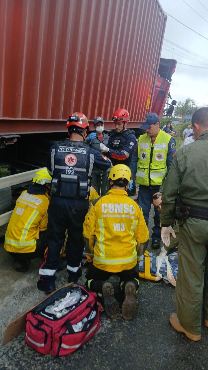 Ao chegarem ao local, os bombeiros confirmaram que se tratava de um atropelamento envolvendo um caminhão cavalo mecânico com carreta reboque, conduzido por um homem que estava consciente, orientado e sem ferimentos, permanecendo no local do acidente.