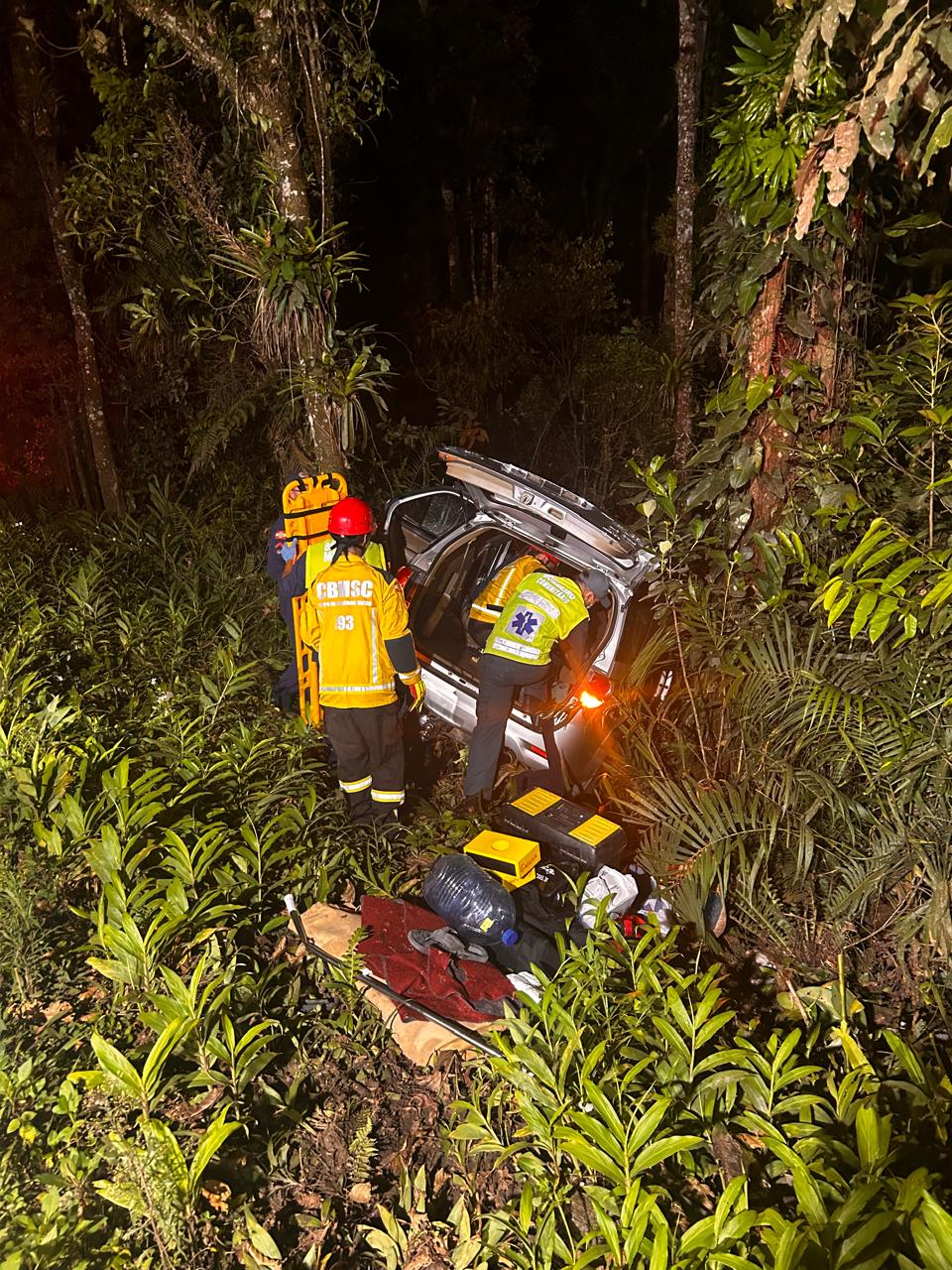 Para que a equipe pudesse acessar o interior da Hilux com segurança, foi necessário estabilizar o veículo com o auxílio de uma catraca presa a uma árvore próxima. Após a avaliação, a vítima foi retirada com cuidado e levada pela ambulância dos bombeiros à UPA (Unidade de Pronto Atendimento) de Garuva.