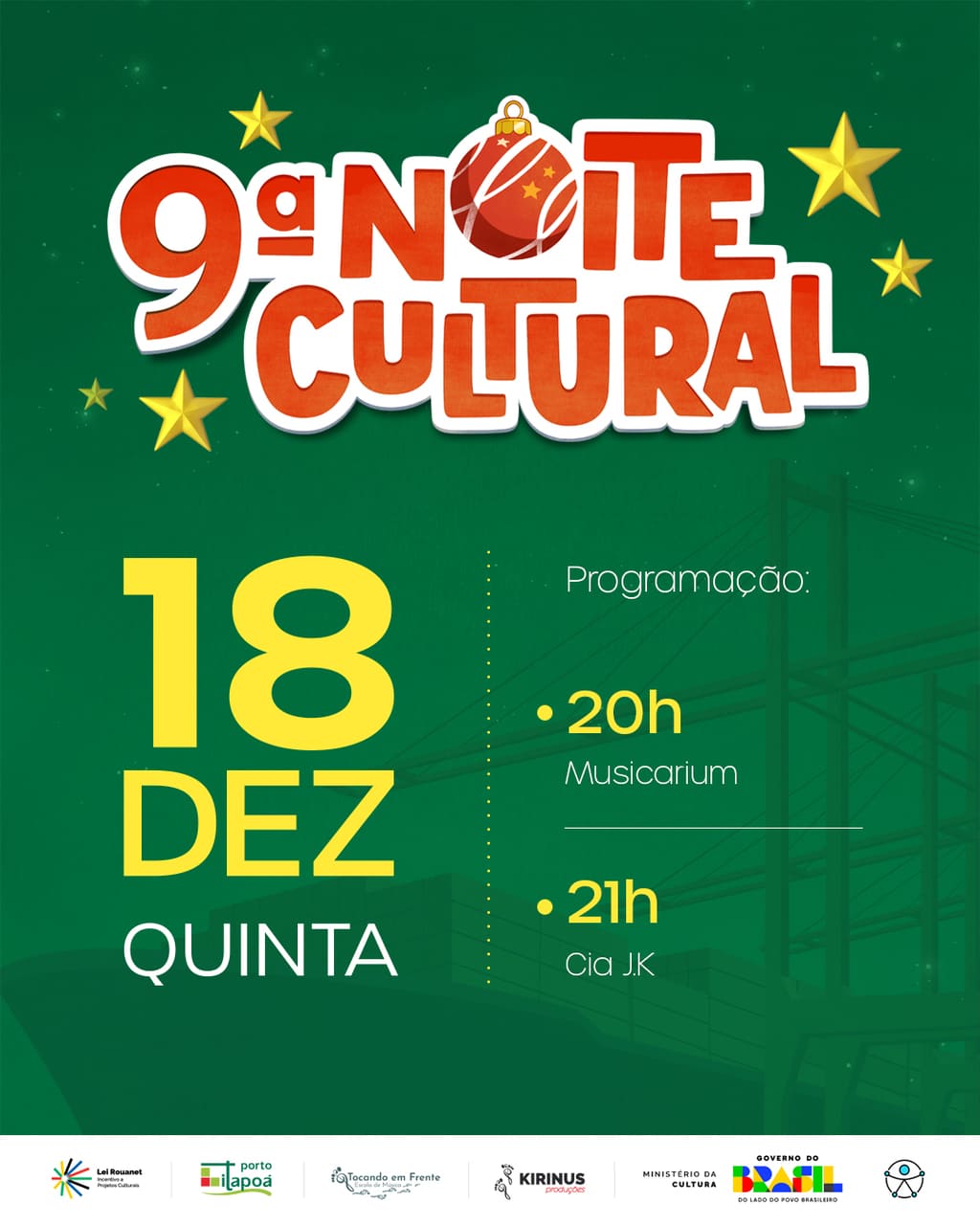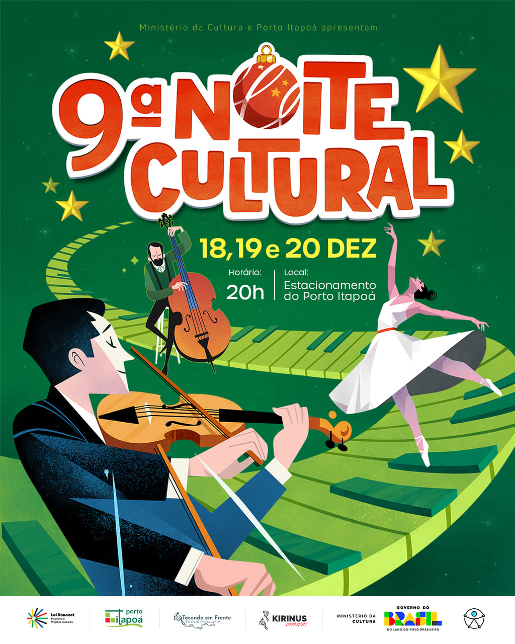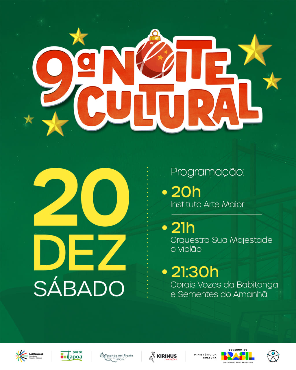 A 9ª Noite Cultural é uma realização do Porto Itapoá através da Lei Rouanet de Incentivo a Projetos Culturais do Governo Federal, em parceria com a Escola de Música Tocando em Frente e a Kirinus Produções.