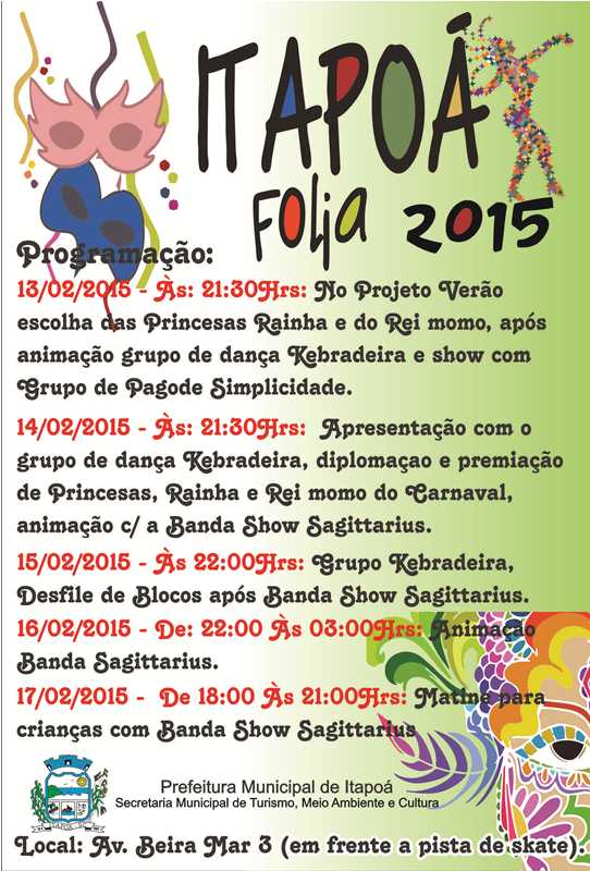 Segundo divulgado pela Prefeitura de Itapoá, por intermédio da Secretaria Municipal de Turismo, Meio Ambiente e Cultura, o Município contará com cinco dias de programação neste carnaval 2015.