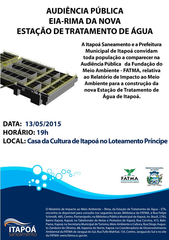 Audiencia Pública da nova ETA de ItapoáToda a população de Itapoá está convidada a participar da audiência pública da Fatma (Fundação do Meio Ambiente de Santa Catarina) referente ao RIMA (Relatório de Impacto Ambiental) para a construção da nova ETA (Estação de Tratamento de Água) de Itapoá.