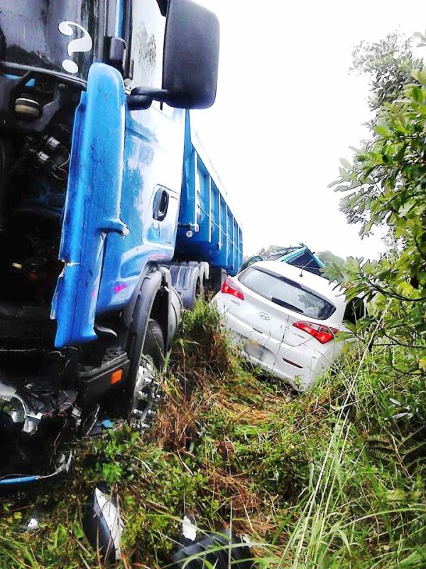 Três caminhões e dois automóveis se envolveram em um grave acidente no km 7 da Rodovia SC-417 (que liga Garuva a Guaratuba (PR) e Itapoá). O local da ocorrência fica próximo à entrada do bairro Palmital, em Garuva. A suspeita dos bombeiros é de que o acidente tenha iniciado com uma colisão frontal no início da tarde dessa quarta-feira, dia 29 de abril.