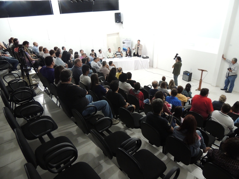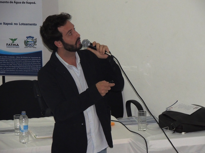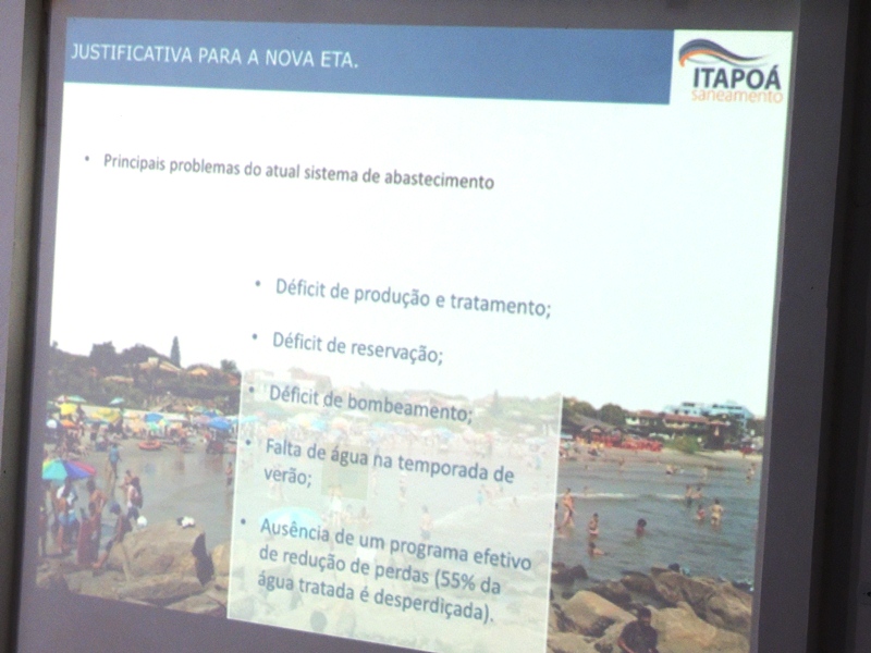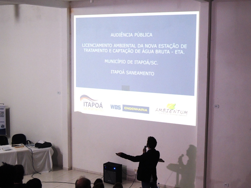 Dando sequência à apresentação do RIMA, um representante da empresa Ambientum falou dos estudos ambientais envolvidos no documento. Ele explicou que, ao contrário da ETA atual, a nova estação de tratamento ficará na área rural do Município, ocupando um espaço de 7 mil m² e com uma estrada de acesso que ocupará 5,225 mil m², totalizando 12,225 mil m². Dito isso, o consultor ambiental expôs sobre as intervenções ambientais positivas e negativas da obra, passando pelos resultados do diagnóstico do meio socioeconômico e citando o Porto Itapoá, um dos grandes responsáveis pelo PIB da Cidade ter quase dobrado de 2006 a 2011, com destaque para o segmento de prestação de serviços. Um estudo sobre a fauna e a flora que será afetada pela construção da nova ETA também foi exposto, além da geologia e geografia local.