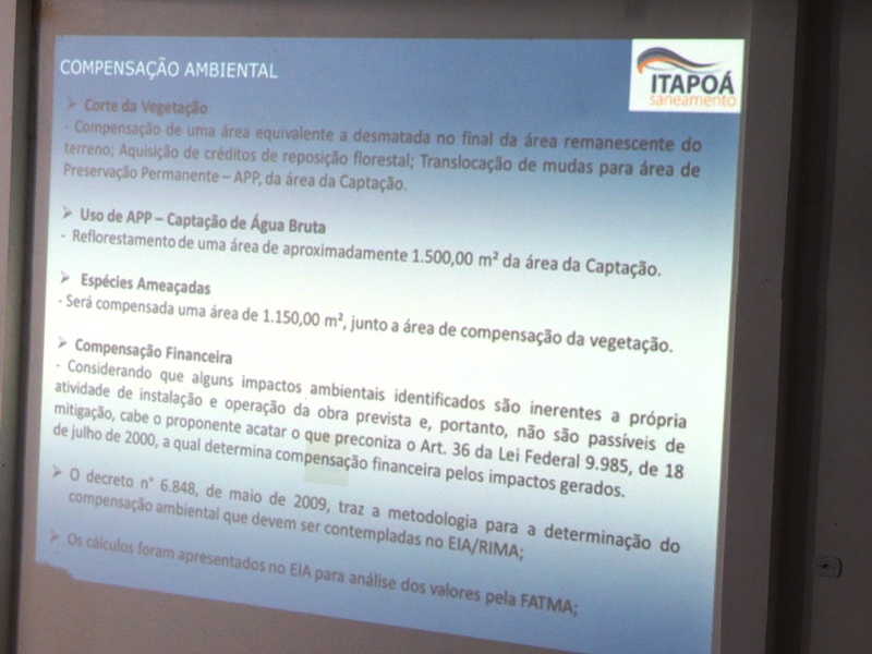 Em seguida, as ações mitigadoras (que servem para amenizar os impactos ambientais) e compensatórias (que compensam os impactos impossíveis de serem amenizados) foram abordados, com destaque para a compensação do corte de vegetação, do uso da APP (Área de Preservação Permanente) para a captação de água bruta e das espécies ameaçadas de extinção. Para essas questões citadas, as medidas compensatórias apontadas foram o reflorestamento de área equivalente à degradada. Além disso, haverá uma compensação financeira, ainda em análise pela Fatma, e vários programas ambientais no sentido de amenizar ou compensar os aspectos negativos da construção da ETA.