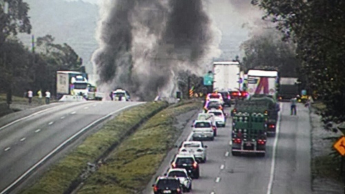 Tráfego na BR-101, em Garuva, interrompido por incêndio em caminhão