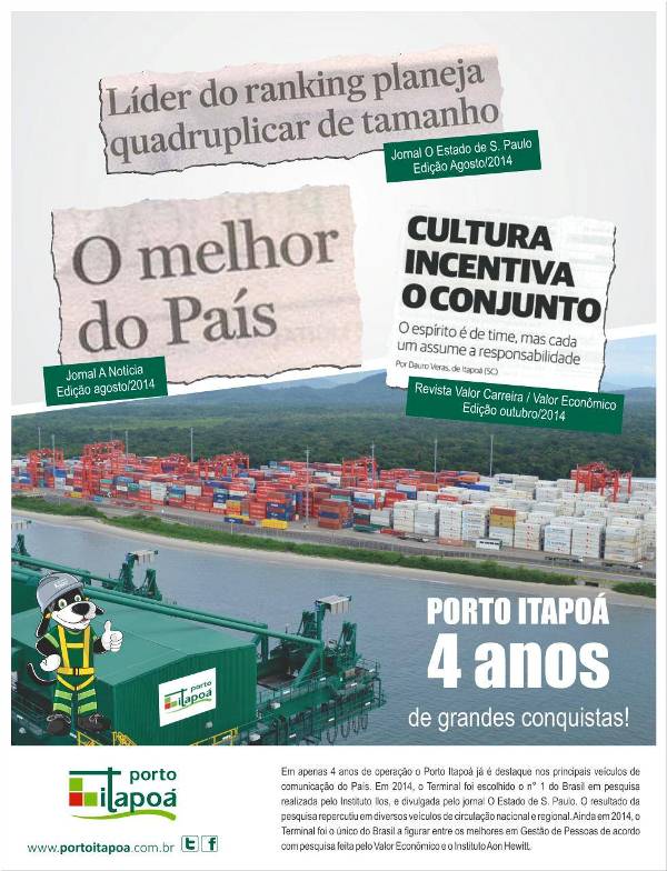 De lá para cá, foram quatro anos de muito trabalho e destaque no cenário nacional. Matérias sobre a eficiência do terminal portuário foram publicadas nos principais veículos de comunicação do País. O ano passado (2014) foi de muitas conquistas para o Porto Itapoá, que foi escolhido o número 1 do Brasil em pesquisa realizada pelo Instituto ILOS e divulgada pelo jornal “O Estado de São Paulo”. O resultado teve repercussão em diversos veículos de circulação nacional e regional. Também em 2014, uma pesquisa realizada pelo “Valor Econômico” e o “Instituto Aon Hewitt” destacou a Gestão de Pessoas do Porto Itapoá, que foi o único terminal portuário do Brasil a figurar entre os melhores nesse quesito.