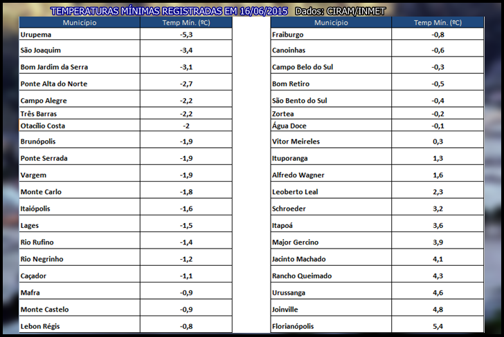 Itapoá registra, nesta terça-feira (16-06-15), a madrugada mais fria do anoCom a temperatura mínima alcançando 3,6°C, a madrugada desta terça-feira, dia 16 de junho, é, até o momento, a mais fria de Itapoá neste ano de 2015. De acordo com a Defesa Civil de Santa Catarina, todo o estado amanheceu com temperaturas muito baixas. As mínimas ficaram abaixo de zero em 26 municípios, sendo que a menor temperatura se deu em Urupema, com -5,3°C. Confira, na imagem abaixo, divulgada pela Defesa Civil, as mínimas mais baixas de cada região catarinense nessa madrugada.
