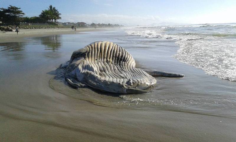 O mamífero, aparentemente da espécie jubarte e medindo de cinco a seis metros de cumprimento, já foi encontrado em estado de decomposição, e o forte odor tem causado grande preocupação a quem mora na região, principalmente àqueles cujas residências ficam mais próximas da orla.