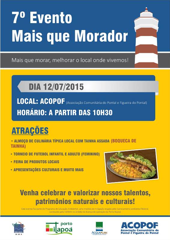 Conforme divulgado em nota pela fanpage (Facebook) do Porto Itapoá, neste domingo, dia 12 de julho, a partir das 10h30min, será realizada mais uma edição do evento “Mais que Morador”, cujo tema é “Mais que morar, melhorar o local onde vivemos”.