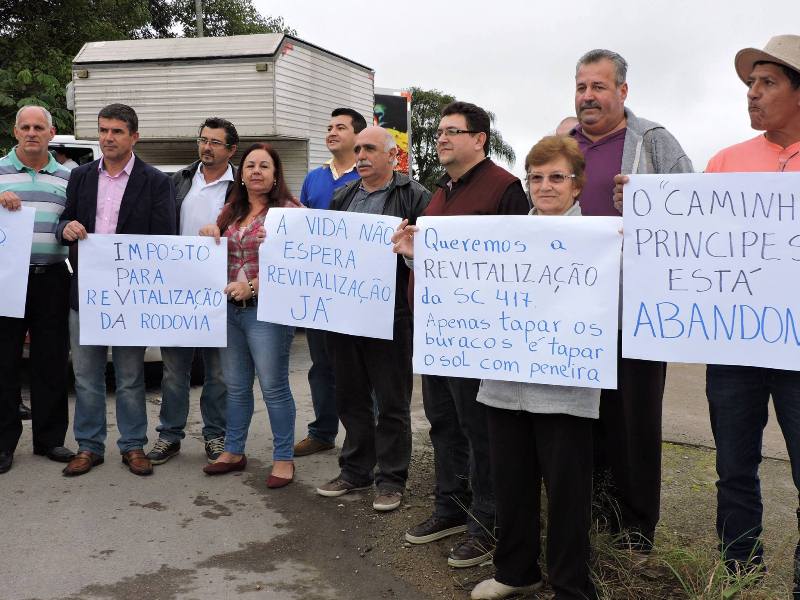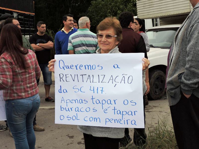 Diversos cartazes foram expostos pelos manifestantes. “Queremos a revitalização da SC 417. Apenas tapar os buracos é tapar o sol com a peneira”; “IPVA – Imposto Para a Revitalização da Rodovia”; e “A vida não espera, revitalização já” foram algumas das frases que podiam ser lidas.