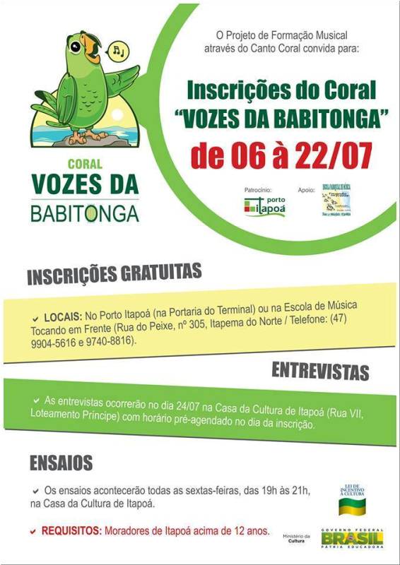 De acordo com a Prefeitura de Itapoá, o projeto de “Formação Musical através do Canto Coral” convida os interessados a fazerem parte do coral “Vozes da Babitonga” para que realizem suas inscrições até o dia 22 de julho, das 10h30min às 20h30min, na Escola Tocando em Frente, localizada à Rua do Peixe, nº 305, do balneário Itapema do Norte, ou na portaria do Porto Itapoá.