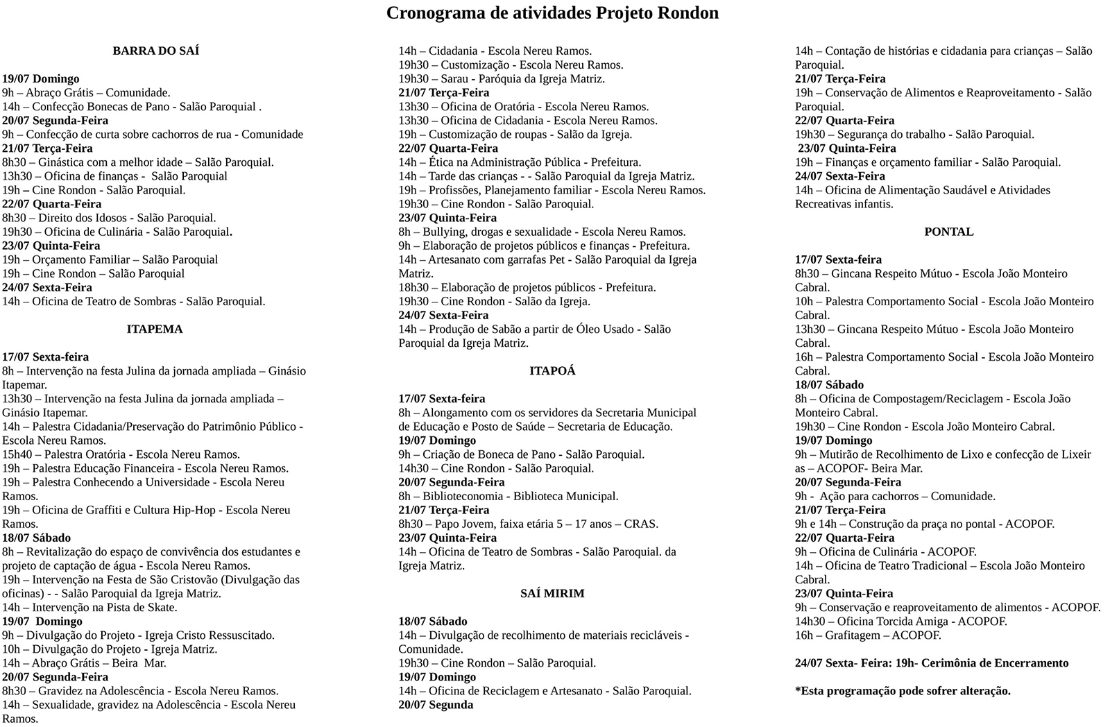 Até esta sexta-feira, dia 24 de julho, o Projeto Rondon segue desenvolvendo atividades em Itapoá. As ações são nas áreas de educação, saúde, cultura e sustentabilidade. De acordo com a Assessoria de Imprensa da PMI (Prefeitura Municipal de Itapoá), são diversas ações com destaque à produção de lixeiras e pranchas de “stand up” com garrafas pet. Para essas atividades, os organizadores do Projeto estão solicitando que a comunidade itapoaense os auxilie, doando esses materiais. As garrafas poderão ser entregues no decorrer das atividades que estão listadas no cronograma abaixo: