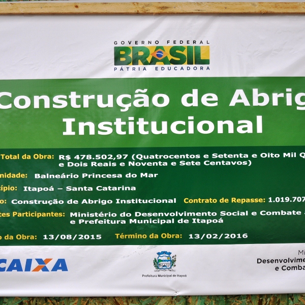 Os recursos para essa obra foram aprovados em 2014, quando o Município foi contemplado com recursos da União, por meio de emenda parlamentar, do, então, senador Luiz Henrique da Silveira (em memória). Esses recursos diziam respeito à “estruturação da rede de serviços de proteção social especial – construção de abrigo institucional” no valor de R$ 443 mil.
