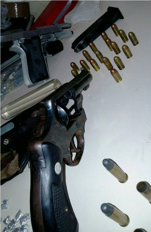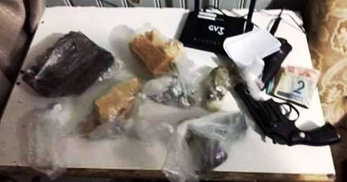 Já em Joinville, no bairro Iririú, Misael Antonio Jungo, de 32 anos, foi preso. Contra ele, havia um mandado de prisão em aberto pela comarca de Londrina (PR). Com ele, a PM encontrou vários frascos de medicamentos contra a impotência sexual, anabolizantes, cartelas de ansiolíticos, 21 munições de calibre 38 intactas, 18 munições de calibre 380 intactas, duas munições de calibre 38 deflagradas, 01 revolver calibre 38, com numeração suprimida, uma pistola PT 380 modelo PT58, com capacidade para 12 disparos e com dois carregadores, 50 munições de calibre 22 intactas, 200 porções de substância semelhante à crack embaladas em papel alumínio, prontas para a venda, lança perfume, máquina de débito, celulares, balança de precisão, notebooks, aproximadamente 1kg de substância semelhante à maconha, divididas em 06 porções, aproximadamente 980 gramas de substância semelhante à crack, divididas em 11 porções, uma espingarda de pressão, diversos pacotes de cigarro, um coldre e R$ 9.085,50 em dinheiro, juntamente a um caderno com anotações e prestações de contas.