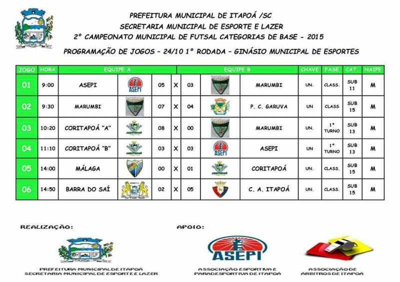 As rodadas do 2º Campeonato Municipal de Futsal são realizadas todos os sábados no Ginásio Municipal de Esportes de Itapoá, ao lado da Escola Municipal Frei Valentim, no balneário Itapoá.