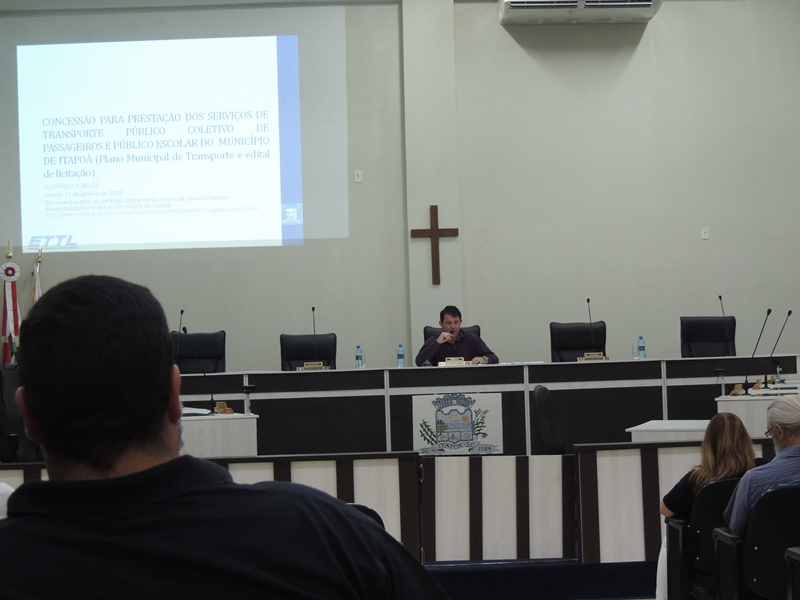 Audiencia apresenta novo Plano Municipal do Transporte Publico Coletivo de Itapoa - PrincipalNa noite dessa quarta-feira, dia 13 de janeiro, a Prefeitura de Itapoá realizou, na sede da Câmara de Vereadores local, uma audiência pública para a apresentação do novo Plano Municipal do Transporte Coletivo de Itapoá. Tal evento foi presidido pelo chefe de gabinete do Poder Executivo Municipal, Luis Carlos Zagonel.
