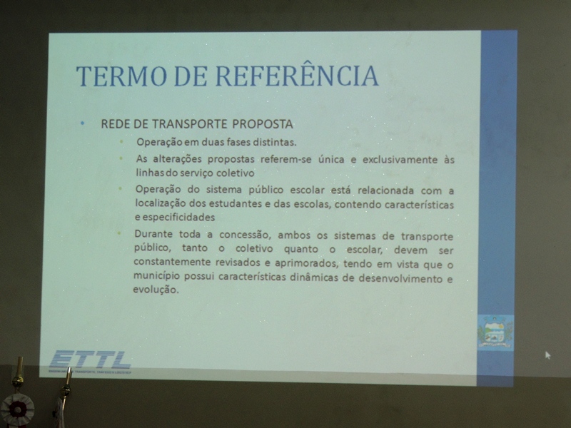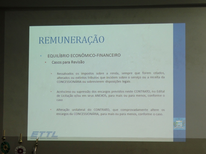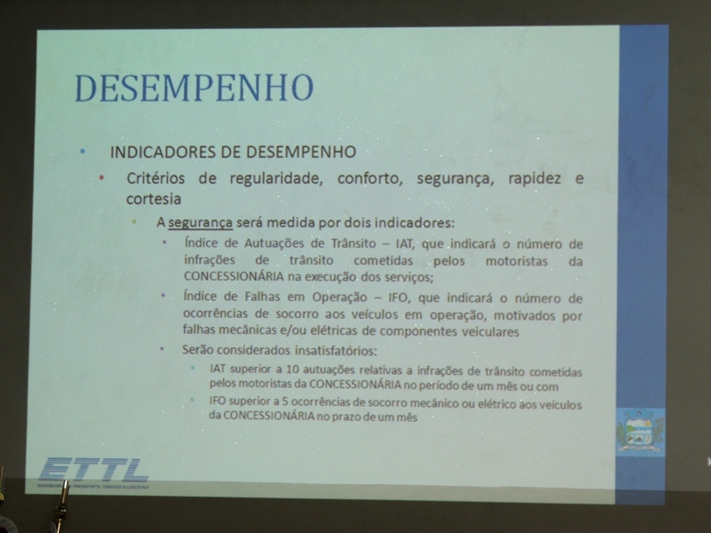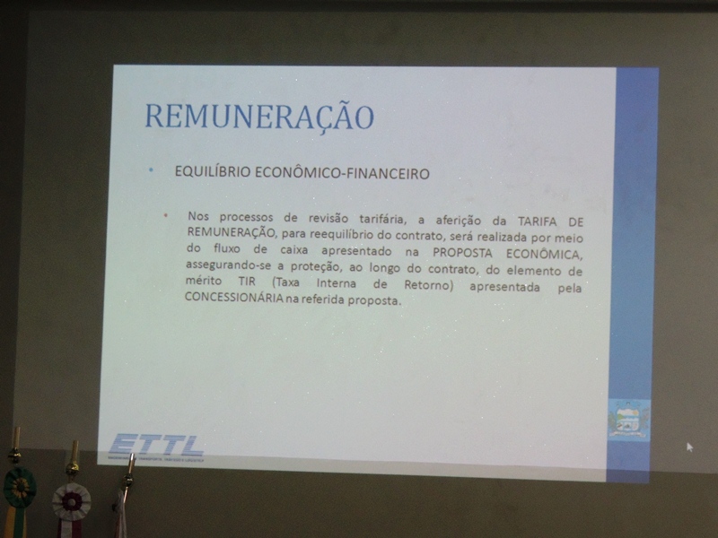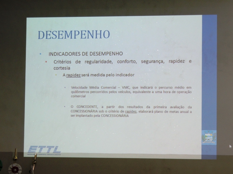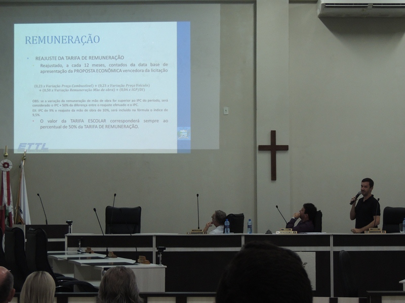 Em seguida, Rodrigo Verroni passou a explicar questões técnicas pertinentes à licitação a ser realizada para a concessão do serviço público de transporte coletivo na Cidade. O valor estimado do contrato, que terá vigência de 15 anos, é o de R$ 7.358.237,88. Também foi detalhado o formato do processo licitatório a ser executado.