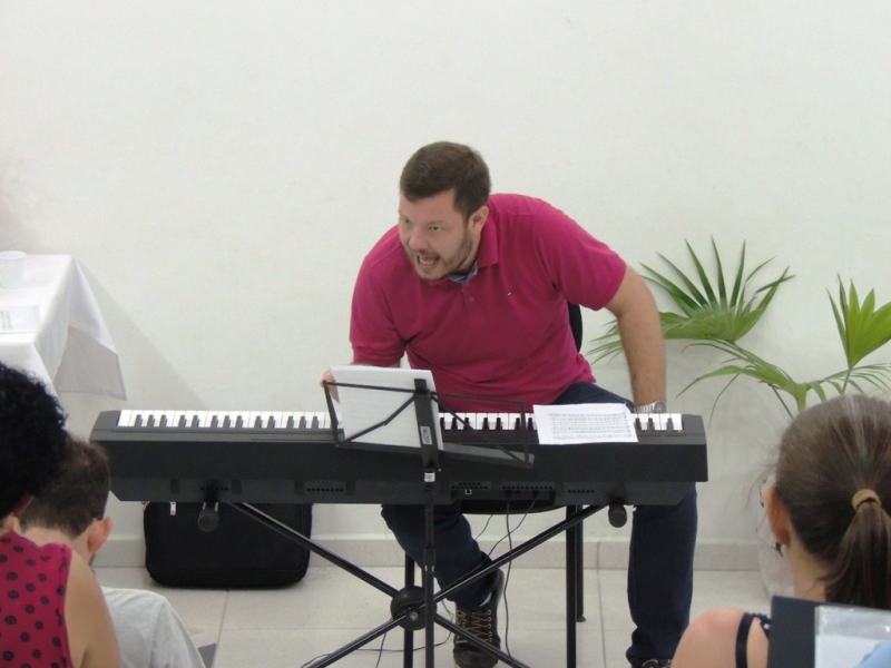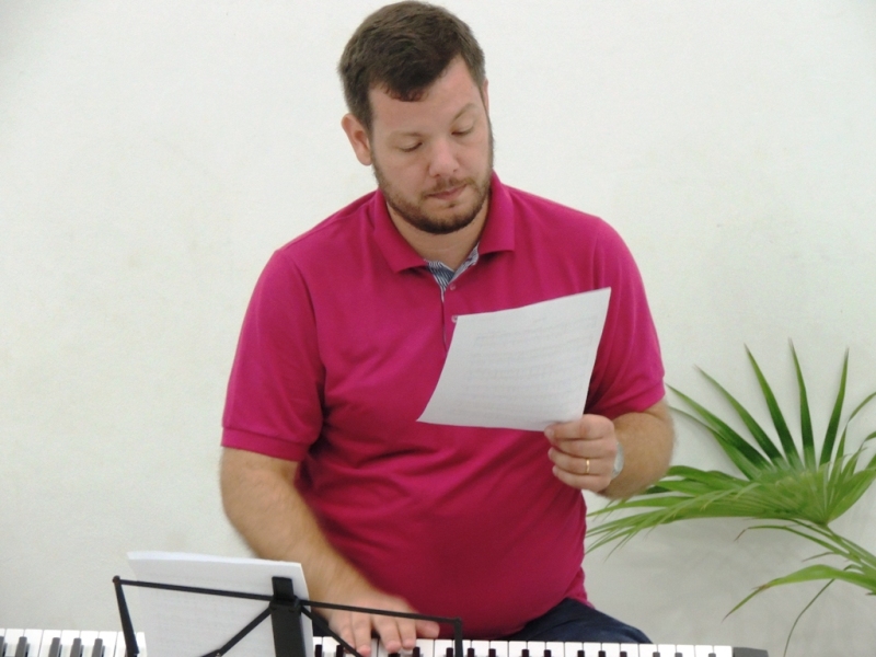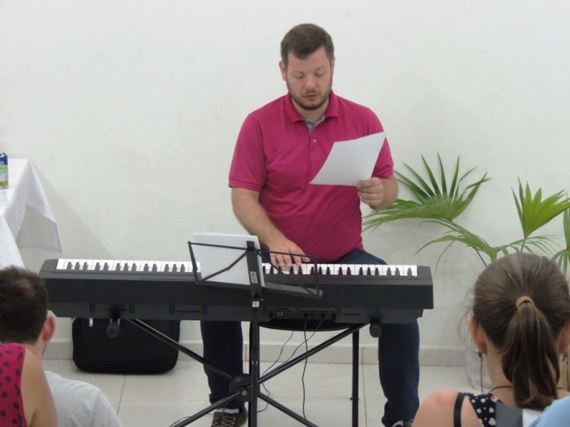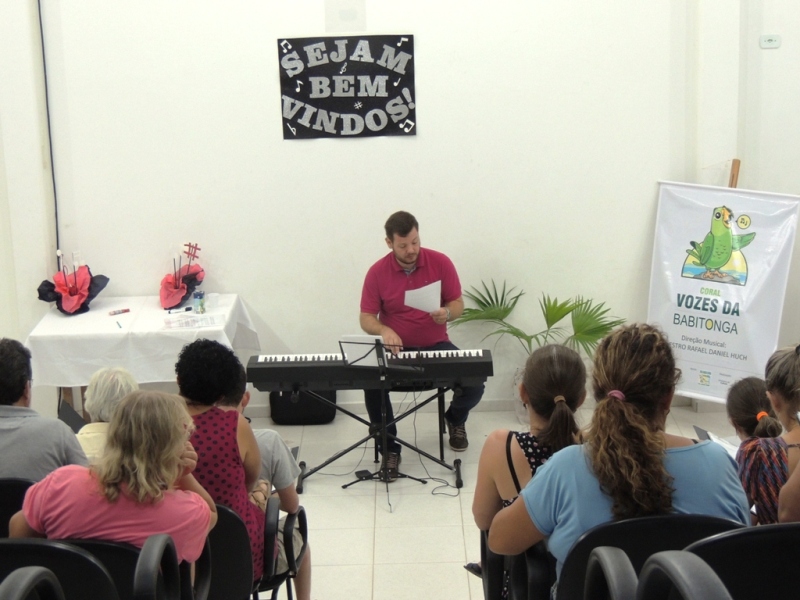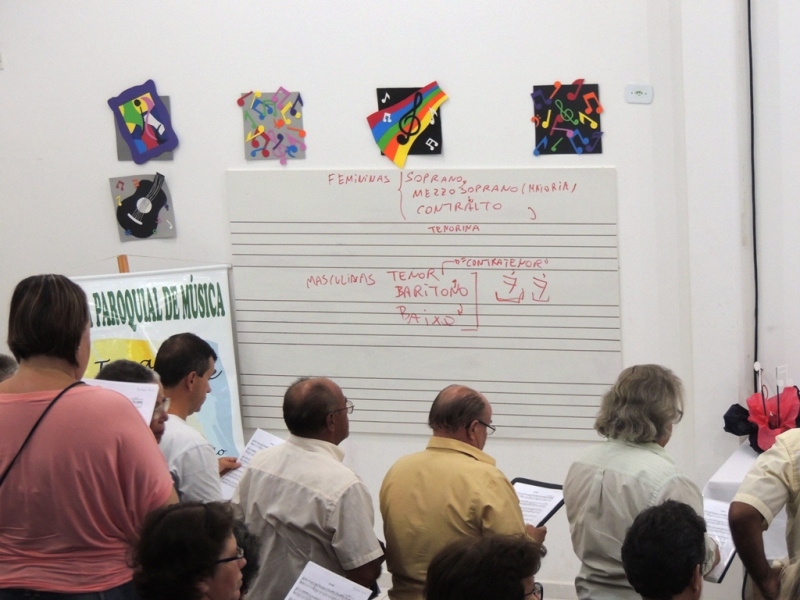 Tão logo os novos integrantes foram apresentados ao grupo, o maestro Rafael Daniel Huch deu início ao aquecimento vocal. Ele detalhou aos seus novos alunos, relembrando aos antigos, como é o funcionamento de um Coral. “Para trabalhar em coro, classificamos a voz em masculinas e femininas. No coral, temos as vozes femininas como sopranos (mulheres com voz aguda) e contraltos (mulheres com voz grave). As vozes masculinas são os tenores (homens com voz aguda) e baixos (homens com voz mais grave)”, explicou.