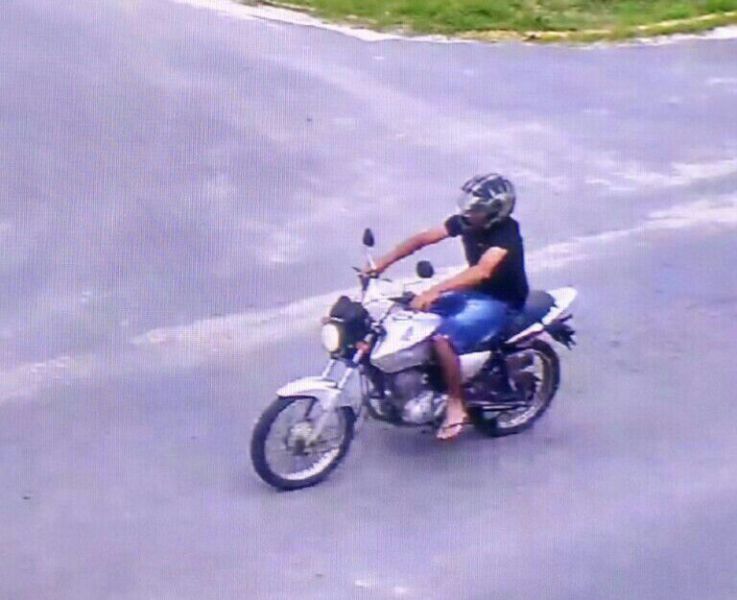 Para tentar identificar o assaltante, a PM local divulgou fotos das câmeras de vigilância em que o suspeito, reconhecido por uma das vítimas, aparece sobre a moto e com capacete.